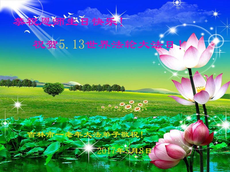 【明慧网二零一七年五月十二日】 吉林市铁东一学法小组恭祝师尊生日快乐!普天同庆5.13世界法轮大法日!