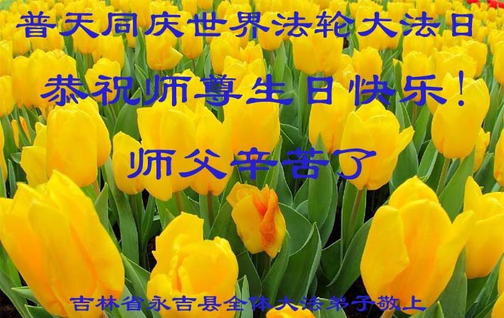 吉林省吉林市全体大法弟子恭贺法轮大法日!恭贺法轮大法洪传二十五周年!恭祝慈悲伟大的师尊生日!恭贺5.13世界法轮大法日! 吉林省吉林市全体大法弟子敬上 吉林省吉林市磐石市大法弟子祝师父生日快乐!恭贺世界法轮大法日!