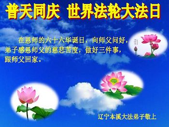 恭祝慈悲伟大的师尊华诞!暨世界法轮大法日! 请师尊放心,我一定要听师尊的话,做好“三件事”,跟师尊回家。 辽宁本溪新安一大法弟子 |