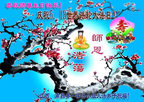 在今年庆祝世界法轮大法日到来之际的同时我们恭祝慈悲的师父生日快乐!我们一定会走好最后最后的路。 江西南昌市一学法小组大法弟子 江西宜春市一大法弟子恭祝慈悲伟大的师父生日快乐!