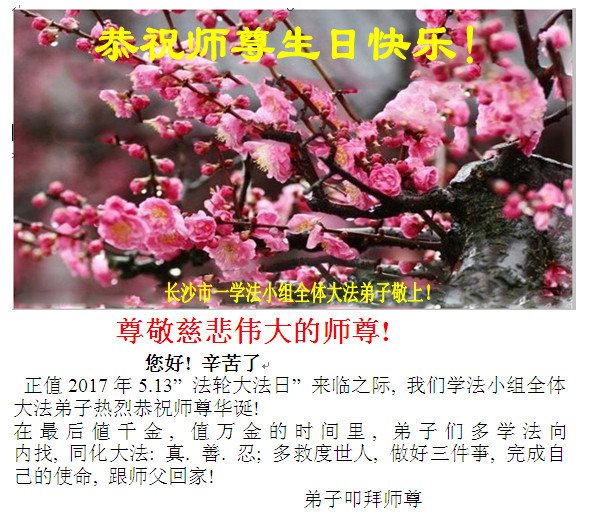 【明慧网二零一七年五月十二日】 湖南省长沙县一学法小组全体大法弟子恭祝慈悲伟大的师尊生日快乐!