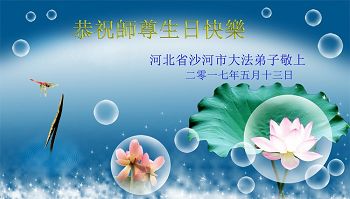 恭祝法轮大法日暨师父华诞。大法洪传二十五周年,我们一直在感受着佛恩浩荡,感谢师父的慈悲救度,把我们从这个肮脏腐败的世界捞出洗净,让我们回归纯净。 在最后的日子里,我们会更加精進,争取救更多的有缘人,再次感谢师父。 哈尔滨大法弟子 2017、5、9 河北省邢台市沙河市大法弟子恭祝师尊生日快乐!