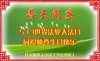 弟子在今后的修炼道路中,不断的向内找,去执着,从生命的最微观到人体的最表面,无条件的同化真、善、忍宇宙大法。按照法的要求做人,做一个修炼的人。 黑龙江佳木斯小弟子恭贺法轮大法日!