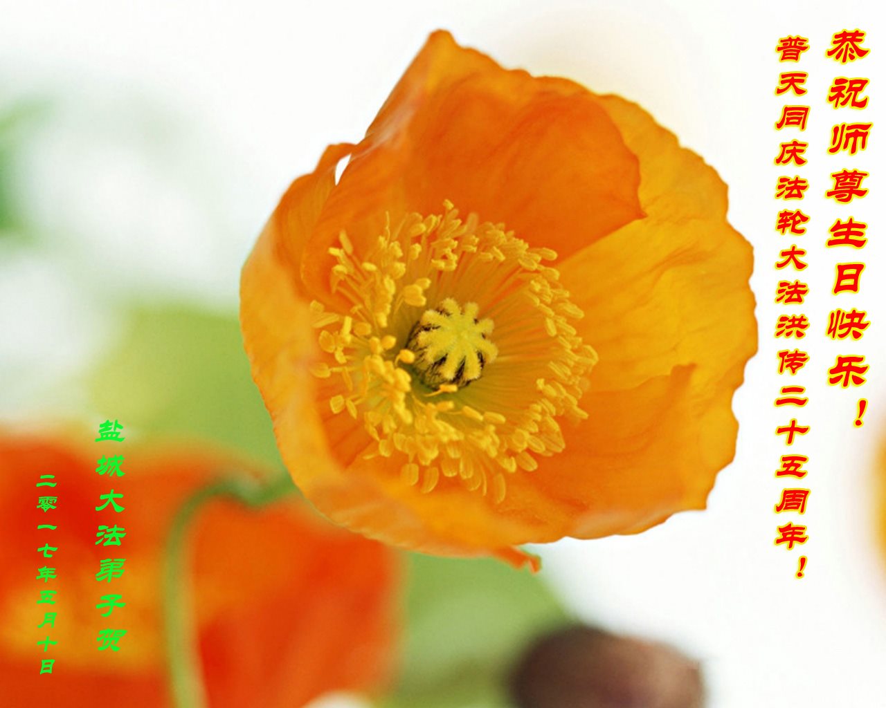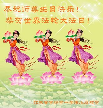 喜迎大法日 万物沐佛恩 普天庆华诞 同心贺师尊 江苏盐城大法弟子恭祝师尊生日快乐!恭贺法轮大法洪传二十五周年!