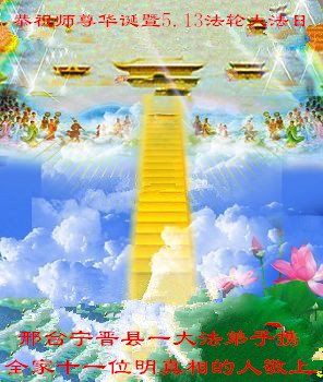 普天同庆世界法轮大法日暨大法洪传二十五周年! 恭祝师尊生日快乐!普天同庆世界法轮大法日暨大法洪传二十五周年! 师尊您辛苦了!您为了您的弟子,为了众生,真的承受了太多,太多。 弟子一定珍惜机缘,修好自己,同化大法,多救人,兑现誓约。 河北省邢台市宁晋县一大法弟子携全家十口明真相人恭祝师尊华诞暨5.13法轮大法日!
