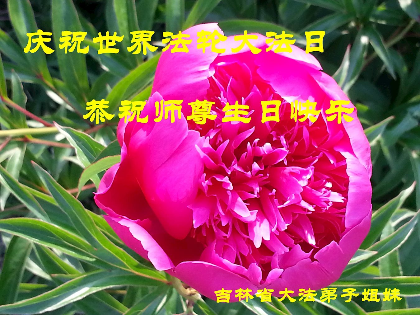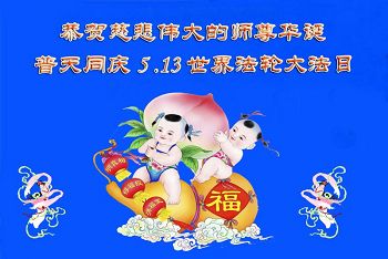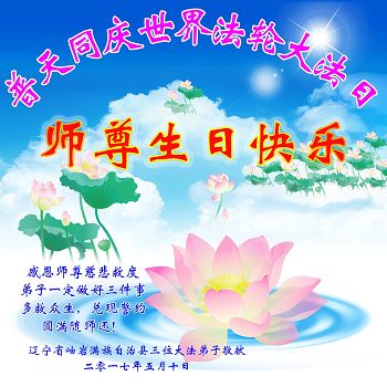 恭祝师尊生日快乐! 并祝贺5.13世界法轮大法日! 在正法最后的有限时间里,我们一定放下所有的执着和人心,精進实修多救人。 紧跟师父正法進程,让师尊多一些欣慰,少一些操劳。 辽宁省辽阳市宏伟区全体大法弟子敬上 吉林省大法弟子姐妹恭祝师尊华诞!
