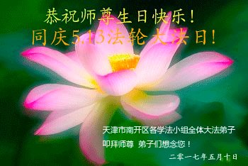 天津市南开区各学法小组全体大法弟子叩拜师尊!我们非常想念师尊!请师尊放心,我们一定不辱使命,做好三件事。走好这最后的每一步。谢谢师尊慈悲救度,感恩师尊!普天同庆“513”法轮大法日! 大陆一大法弟子向慈悲伟大的师尊问候生日快乐!