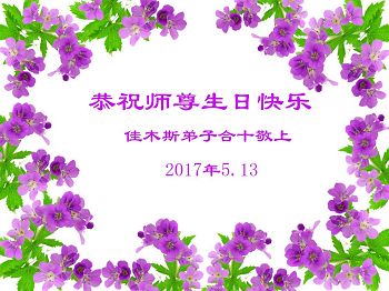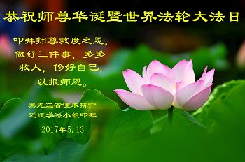 师尊您好:您辛苦啦,此生能成为您的弟子是我们最大的荣幸、对您的感恩我们无法言表,在新的一年里,正法最后时刻,不管遇到任何困难考验,弟子都牢记师尊教诲,努力做好三件事,学好法,提高心性,坚定正念,快救人,多救人!修好自己,跟师尊回家!。 合十 德惠市全体大法弟子叩拜师尊 2017年5月10日 山东省青岛市崂山区一学法小组三家大法弟子及家人恭贺法轮大法日!恭祝师尊生日快乐!