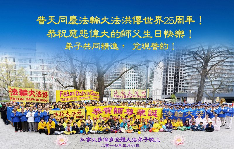 加拿大多伦多全体大法弟子普天同庆法轮大法洪传世界25周年!恭祝慈悲伟大的师父生日快乐!