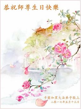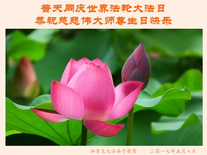 叩谢恩师慈悲度 风风雨雨廿五年, 神人欢庆五一三。 叩谢恩师慈悲度, 多救苍生同回天。 加拿大麦克莫里堡全体大法弟子恭祝慈悲伟大的师尊生日快乐!普天同庆世界法轮大法日!
