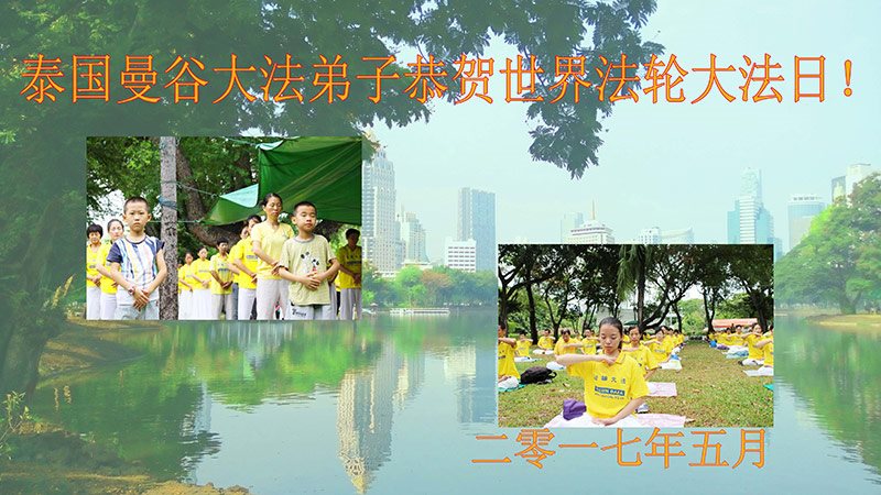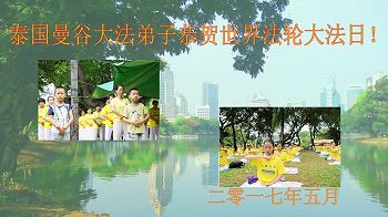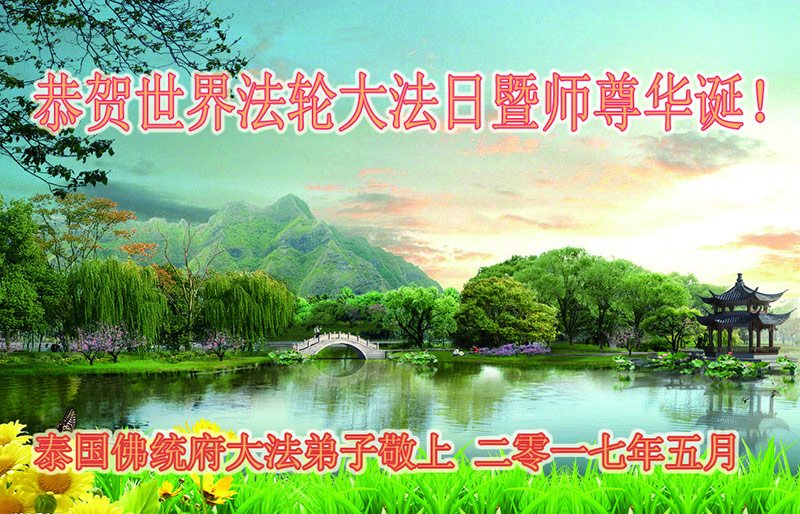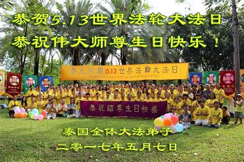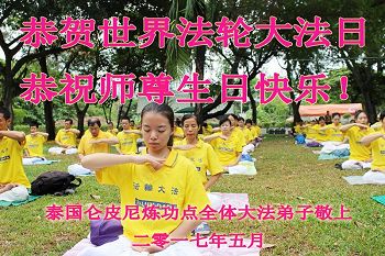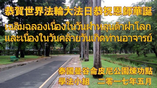 【明慧网二零一七年五月十二日】 泰国曼谷仑皮尼炼功点全体大法弟子恭贺世界法轮大法日!恭祝师尊生日快乐!