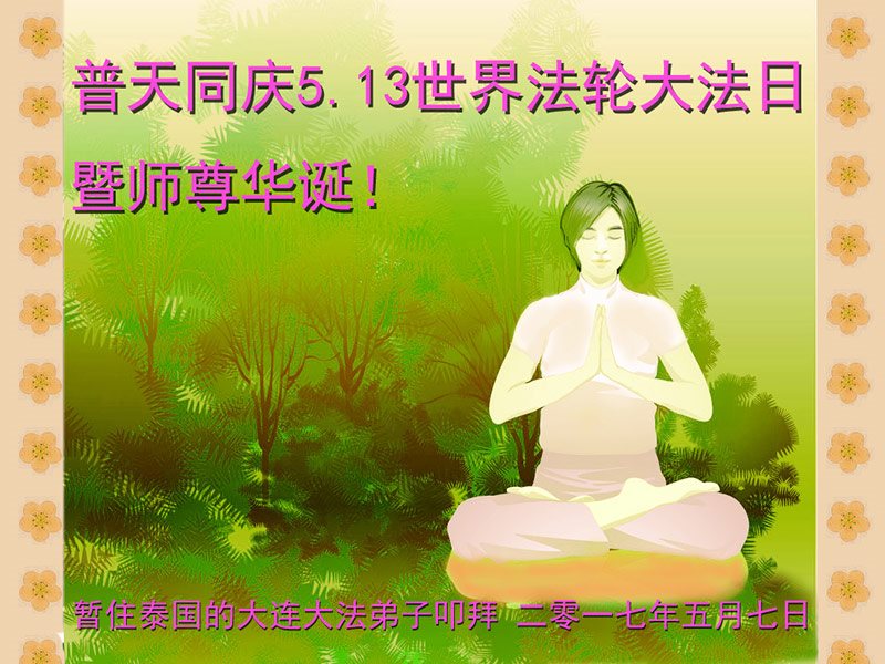 弟子会好好去除执著、圆容整体,无论身在何处,都做好三件事,不负史前誓约。 2017年5月6日 暂居泰国大陆大法弟子恭祝慈悲伟大的师尊生日快乐!庆祝世界法轮大法日!