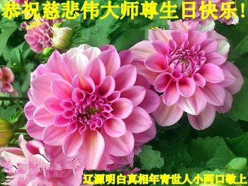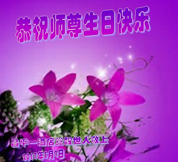 祝李洪志大师生日快乐!法轮大法好!真善忍好! 北京市昌平区一觉醒世人敬上 山东省滨州市明白真相的世人恭祝慈悲伟大的李洪志大师生日快乐!恭贺世界法轮大法日!