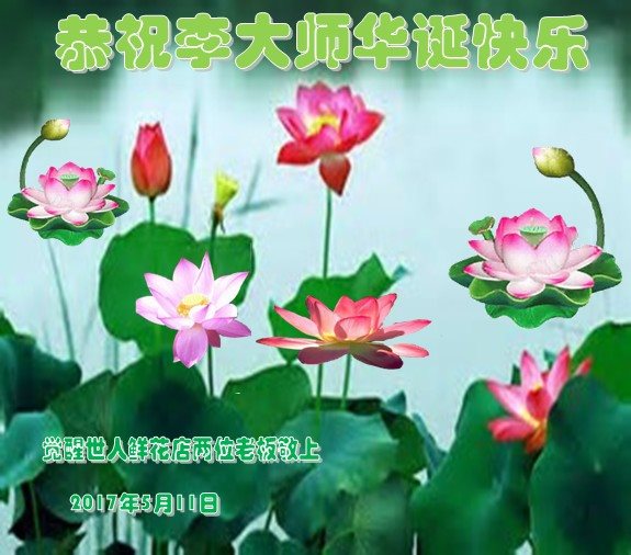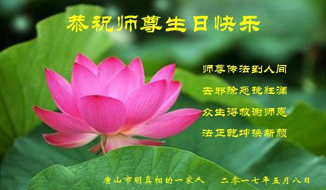 在这普天同庆的日子,作为大法弟子的家属共同见证了师父的慈悲,大法伟大。我知道法轮大法好,真善忍好!祝贺师父生日快乐! 广西钦州市大法弟子的家属敬上 2017年5月11日 觉醒世人恭祝大法师父生日快乐!