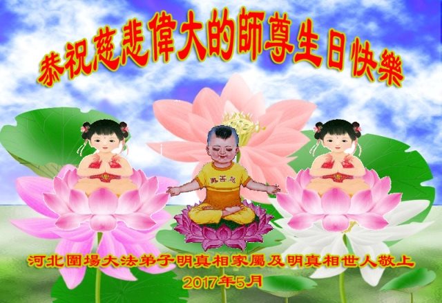 谢谢师父在这特殊的历史时期给了我人身,又与您和大法同在一世;是您安排大法弟子给我讲真相使我更加坚信“法轮大法好,真善忍好”这九字吉言;又是您力挽狂澜、拯救了宇宙、挽救了众生。师父谢谢您,我永远支持法轮大法和大法弟子所做的一切,法轮大法好,真善忍好以牢记心中。 北京大法弟子亲属敬上 2017年5月6日 河北围场大法弟子明真相家人及明真相世人恭祝师尊生日快乐!
