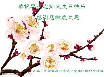 尊敬的李洪志大师好,我和爸爸都读过您的著作《转法轮》,我们知道如何做好人了,我们明白共产党的邪恶,也早已退出它们的邪恶组织,选择美好未来。 谢谢您!祝您生日快乐! 北京退出党团队的众生恭祝李洪志师父生日快乐!