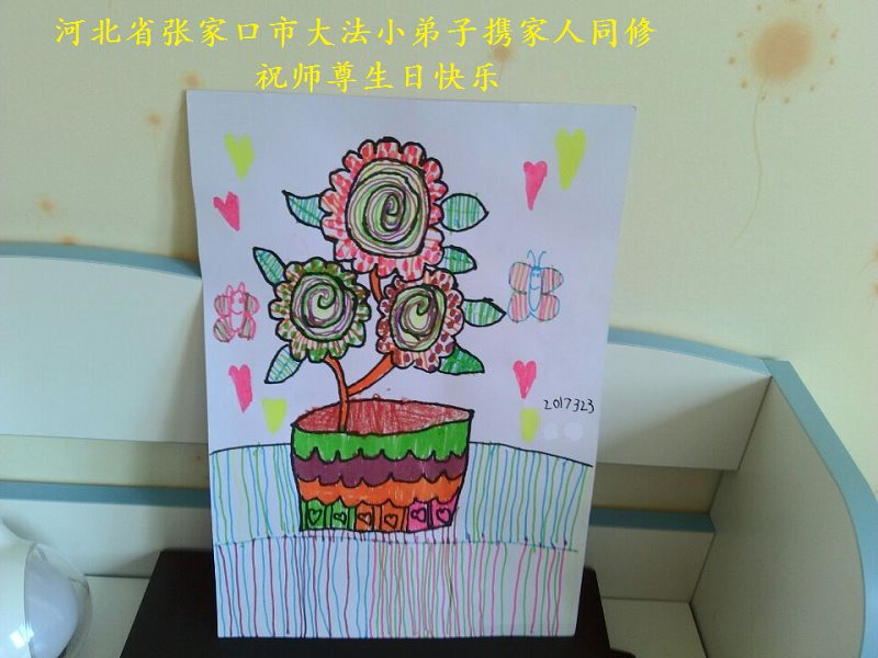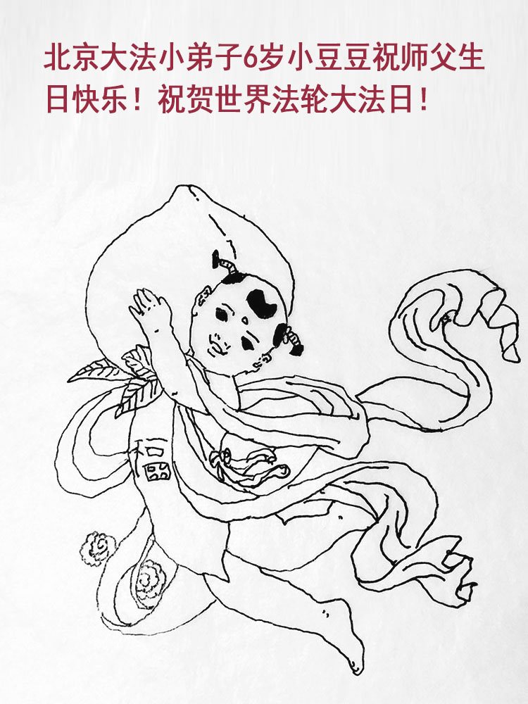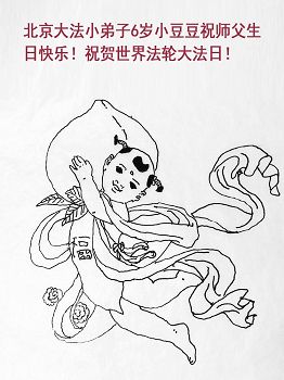 图片是5岁大法小弟子所画。 北京大法小弟子恭祝师父生日快乐!暨世界法轮大法日!