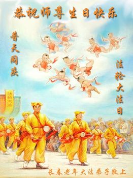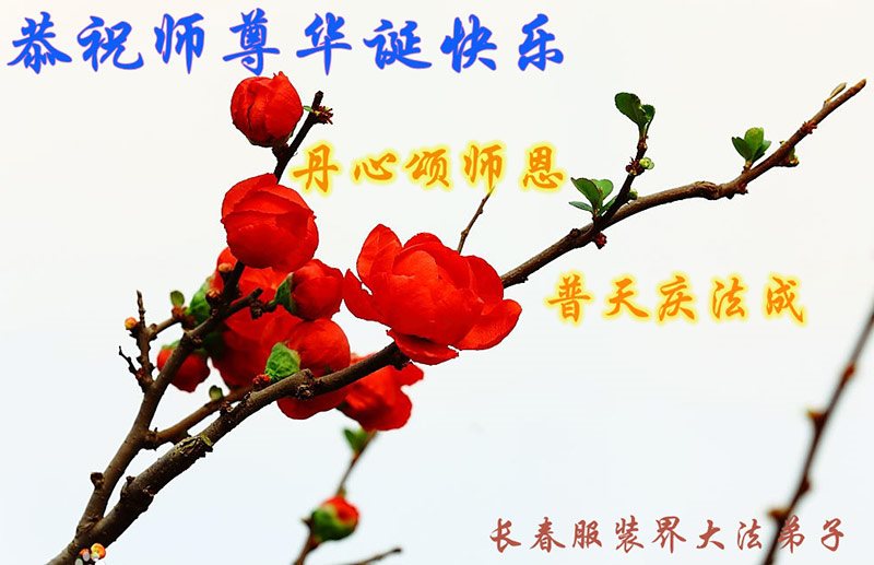 师尊正法十八春 大穹从组乾坤纯 佛恩浩荡法光照 新天新地塑新人 正法洪势到正点 法船启航不等人 修好自己讲真相 不辱使命迎师尊 吉林省长春服装界大法弟子恭祝师尊华诞快乐!