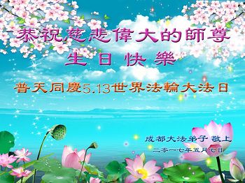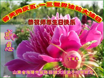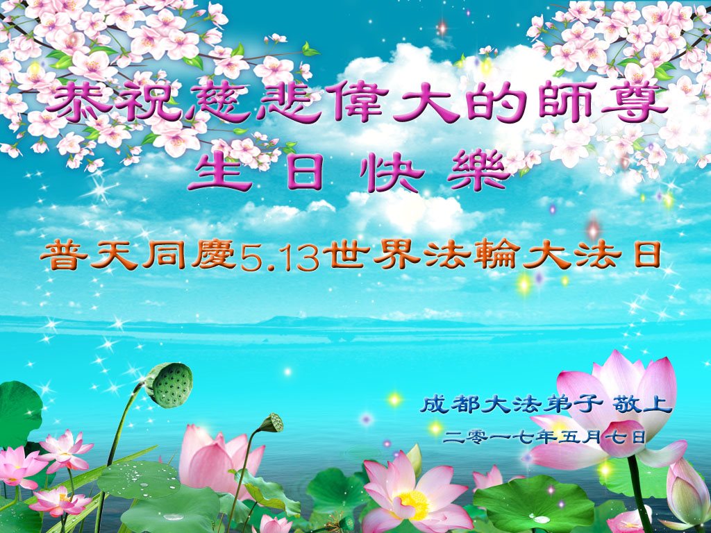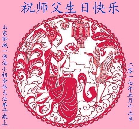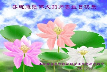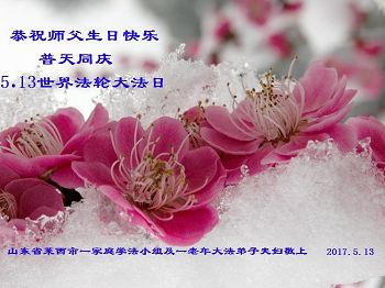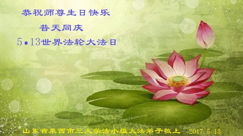 又逢师尊华诞,弟子恭祝师尊生日快乐!祝贺5.13世界法轮大法日! 在这历史的最后时刻,弟子有幸跟随师父下世助师正法,在修炼的路上弟子磕磕跘跘走到今天,是伟大的师父一路上看护着弟子,将弟子从泥潭中捞起来,洗净,洗净。 师父,您辛苦了!千言万语都不能表达弟子对师父的感恩,弟子唯有精進不懈怠,多学法,多向内找,做到真正的实修,兑现自己的誓约,圆满随师还。 成都大法弟子 敬上 二零一七年五月七日 山东省潍坊市昌邑市饮马镇全体大法弟子恭祝慈悲伟大的师尊生日快乐!