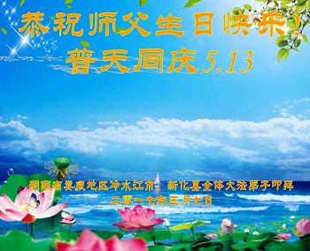 恭祝师尊华诞快乐!普天同庆世界法轮大法日! 黑龙江省哈尔滨市大法弟子敬上 湖南辰溪一大法弟子全家恭贺法轮大法日!