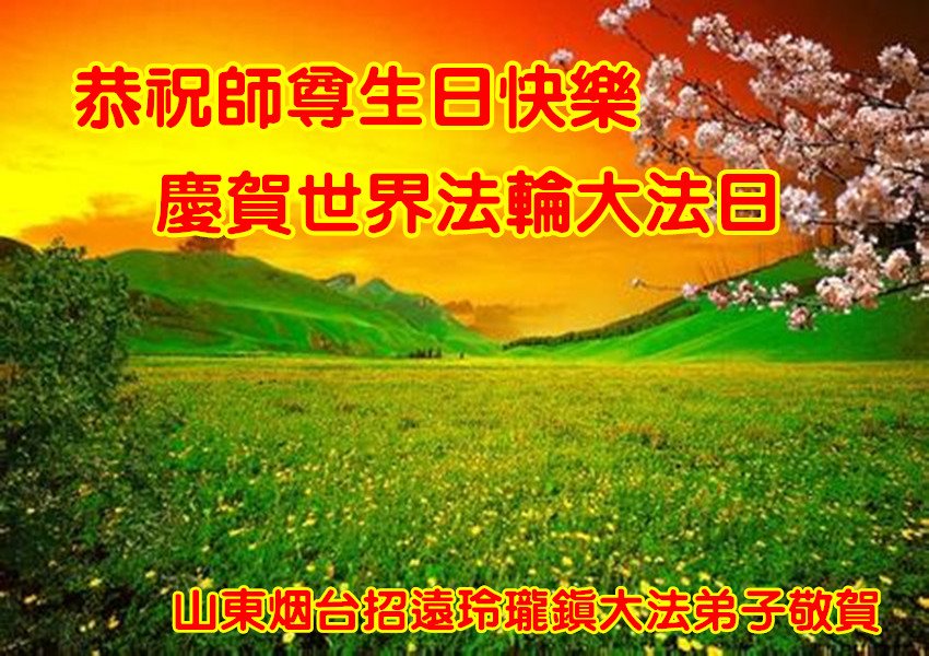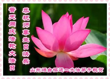 恭祝慈悲伟大的师尊生日快乐!祝贺世界法轮大法日! 能成为师尊的弟子无上荣幸,无上自豪!珍惜师尊用巨大承受、无量付出所延续来的宝贵时间,抓紧时间多救人,学好法,修好自己,回报恩师的慈悲救度之恩! 山东省烟台市招远市一大法弟子恭祝师父生日快乐!恭祝世界法轮大法日!