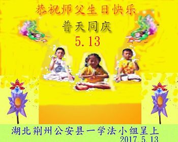 我们一定不辜负师尊的慈悲苦度。时刻牢记自己是个修炼的人,不断的去人心、去执着。多学法,学好法,向内找,做好三件事。走好正法修炼的路。 北京朝阳区两家庭大法弟子 二零一七年五月二日 湖北省荆州市公安县一学法小组全体大法弟子恭祝师父生日快乐!