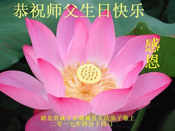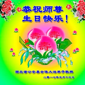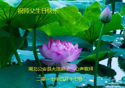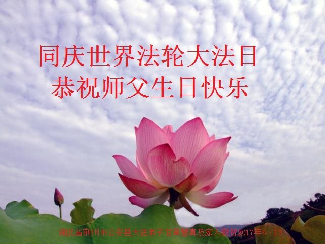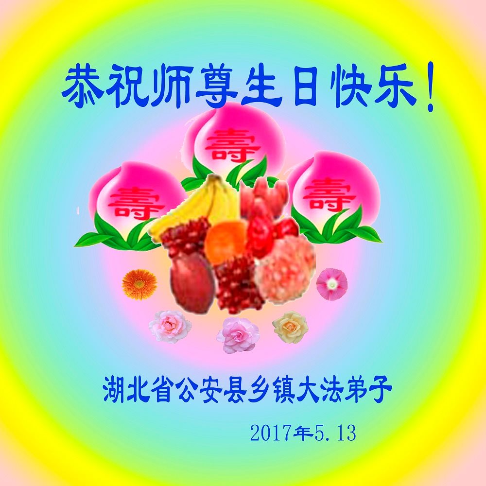 湖北省咸宁市通城县大法弟子恭祝第十八届世界法轮大法日!谢师恩! 师父正法一再延续时间,成就大法弟子,救更多人,这浩荡的佛恩是弟子永远报答不了的。 谢谢师父,我会在今后做好的,走正自己的路,救更多的人,完成自己的史前大愿。 咸宁市通城县大法弟子敬上 二零一七年四月十四日 湖北省荆州市公安县大法弟子恭祝师父生日快乐!