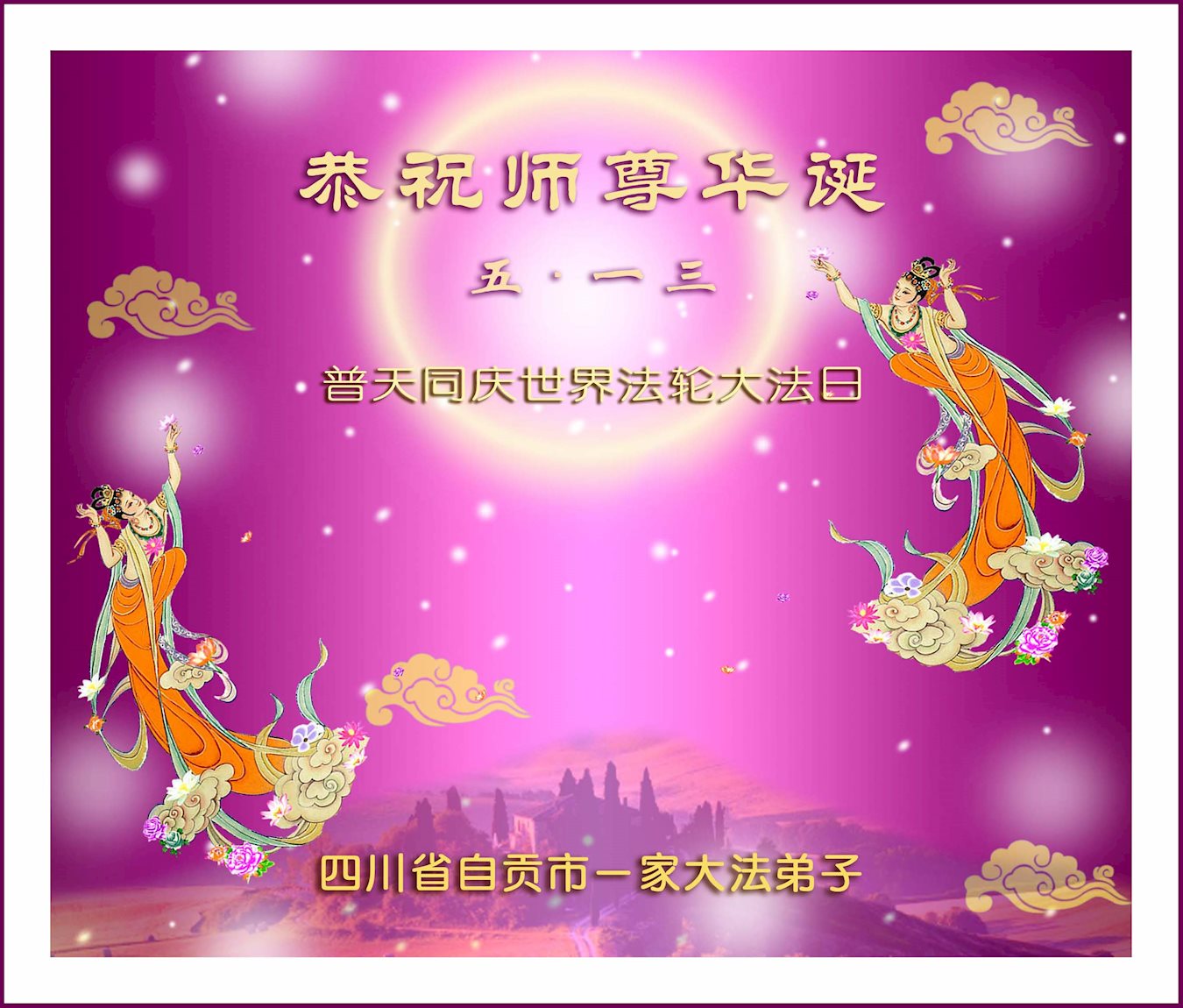 四川省自贡市一家大法弟子恭祝师尊华诞暨世界法轮大法日!多谢师尊慈悲救度!师尊您辛苦了!