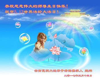 祝慈悲伟大的师尊生日快乐! 身为弟子,我们在各自的工作岗位上应时刻按照大法的法理来对照自己的一言一行,谨记师尊教诲,不能与常人攀比,不能放任自己的行为,不能放纵自己的后天人心与执着。无论什么常人的岗位,我们都不要忘了自己是个修炼的人,是个真正的修炼者,是肩负救度众生使命的大法徒。 弟子对师尊的感恩无以言表,唯有修好自己,做好三件事,以表弟子的真正感恩! 弟子遥祝师尊生日快乐!万事如意! 合十!叩首!再叩首! 大陆金融行业大法弟子敬上 四川省供销社系统大法弟子热烈祝贺世界法轮大法日!