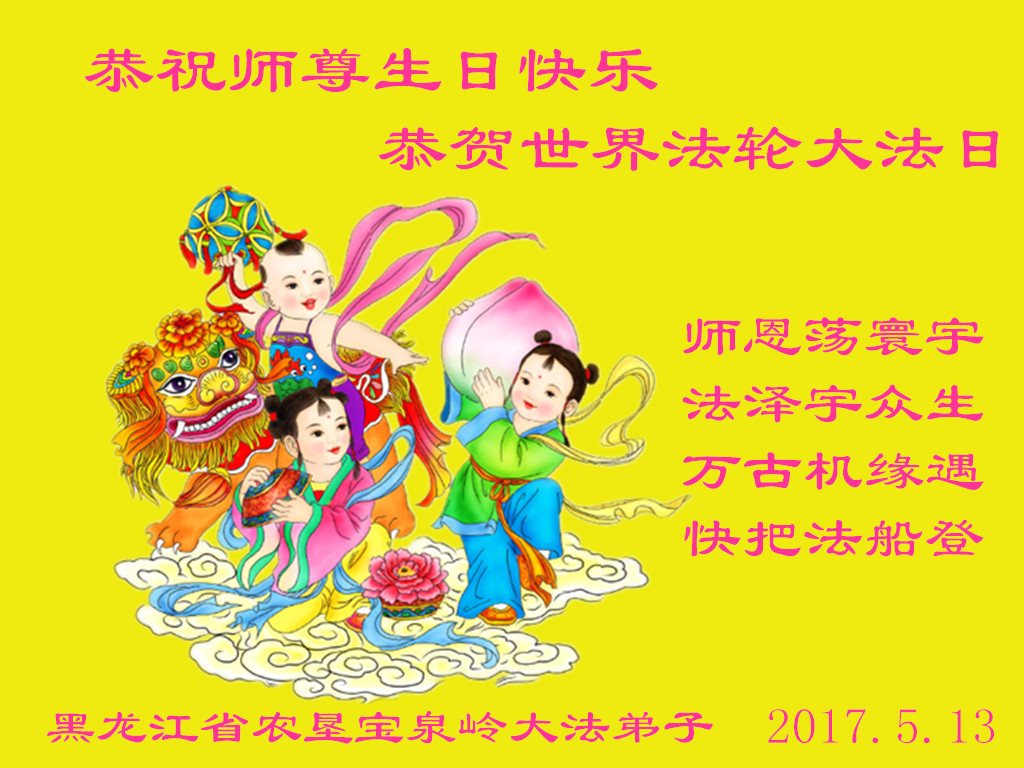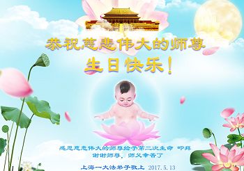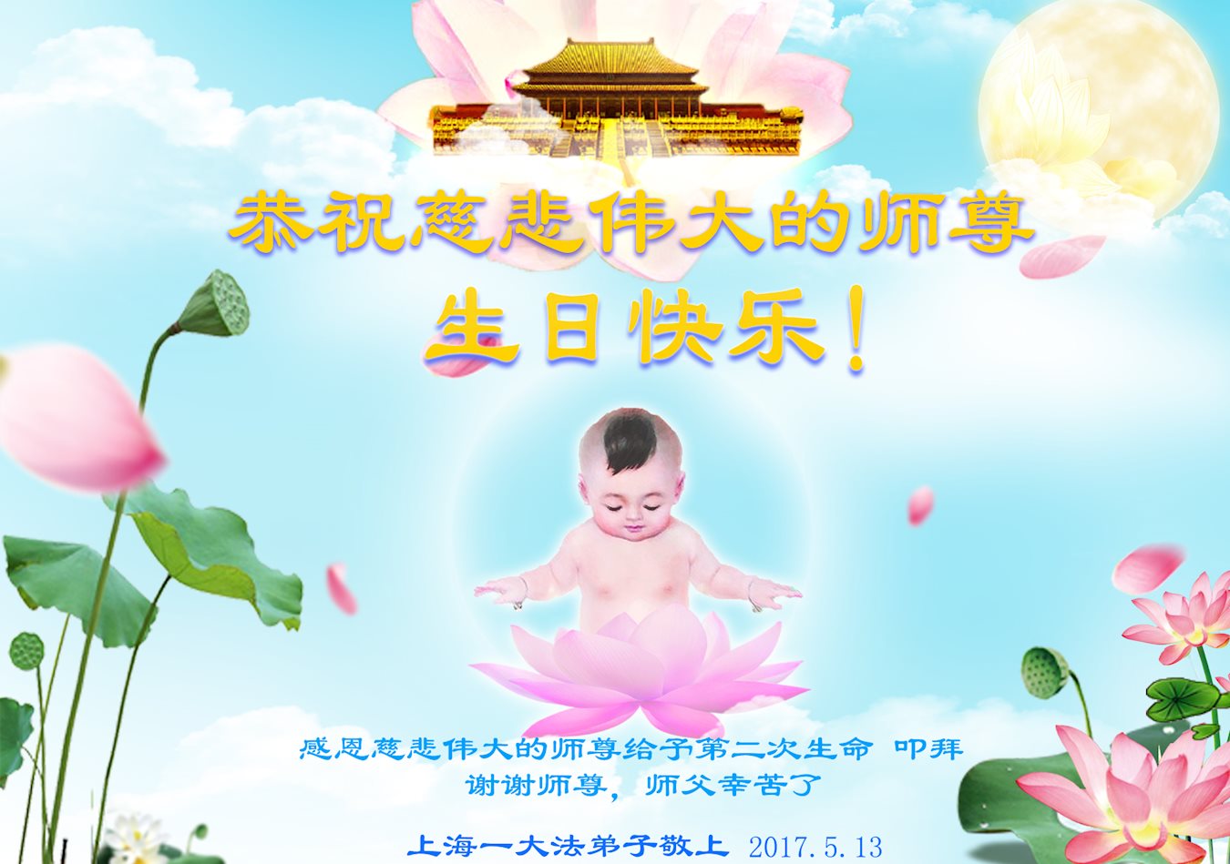 恭祝无上慈悲的师尊生日快乐!弟子无法用语言感恩师尊再造之恩,感恩师尊给我们全家及亲朋好友带来福祉。弟子唯有实实在在的做好三件事、彻底修去各种人心、执着、兑现好誓约,才能不负师恩。 弟子及全家叩拜 二零一七年五月七日 上海大法弟子恭贺法轮大法日!