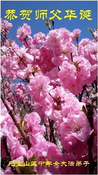 师尊您好!《梅花诗》曾预言,一院奇花春有主,我们深信这个春天即将到来,我们将见证在这个春天的某一天,大法弟子和世人恭迎师尊还乡!在这辞旧迎新的时刻,人间任何美好的词句都表达不尽弟子对师尊的感恩,弟子倍感这一刻值千金,值万金,只有抓紧时间精進实修,做好三件事,多救世人,以报师恩,圆满随师还。 山东教育系统全体大法弟子恭祝师尊华诞暨世界法轮大法日!