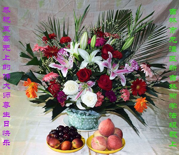 恭祝至高无上的伟大师尊生日快乐! 又蓬五一三,新吉林两个学法小组的同修怀着无比崇敬的心情,无限感恩伟大师尊的慈悲苦度!我们买来了鲜花水果恭祝师尊生日快乐! 报师恩 一入红尘迷中晕 辗转轮回千百春 人世茫茫苦沉沦 名利情中造业深 幸遇恩师传大法 捧给众生转法轮 弟子方从迷中醒 下世原为寻师尊 誓约使命担在身 为了弟子能得救 师尊苦度操碎心 弟子唯有再精進 三件事上尽全心 修好自身多救人 兑现誓约报师恩 吉林市龙潭区新吉林两学法小组大法弟子跪拜师尊! 吉林市全体大法弟子跪拜师尊!