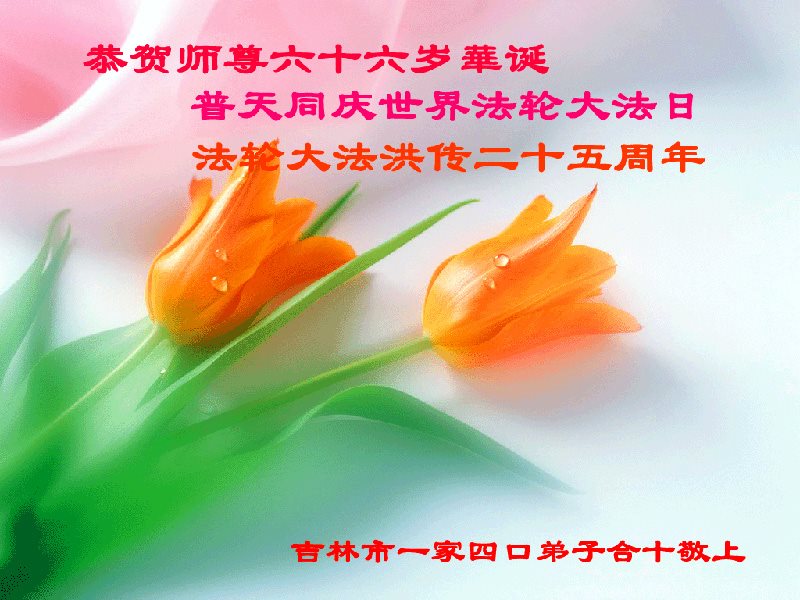 吉林省吉林市大法弟子及大法小弟子谢谢师尊多年来慈悲救度,弟子无法形容对师尊的感激,更无法报答师尊的慈悲保护,弟子一定要加强正念,修好自己,去掉执着,做好三件事。恭贺法轮大法日,恭祝师尊生日快乐!跪拜,合十。 中国吉林省吉林市祖孙4名大法弟子及18名了解真相的家人共同敬贺世界法轮大法日!
