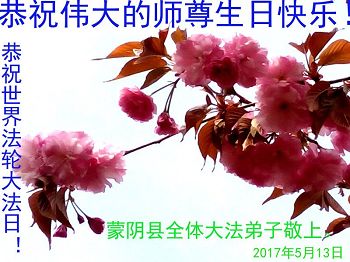 从1992年到2017年,大法传世已有25年,弟子有幸在大法中修炼也有18年了。随着修炼的深入,我越来越领会到大法的深奥与玄妙。弟子一定会努力遵照大法的标准修好自己。 邪恶迫害不会久了,我们都看到了,只是那些还没有明白真相的,与还在参与迫害的人,他们得救的机会越来越少了,真心希望他们能够理智的考虑一下,能做出符合自己良心的选择,他们的良心也是他们得救的机会。弟子知道现在就是修好自己放下人心慈悲救人,弟子会努力。 在2017年世界法轮大法日到来之际,恭祝师尊生日快乐! 上海大法弟子 2017.5.8 河南省商丘市民权县全体大法弟子恭祝师尊生日快乐!暨世界法轮大法日!