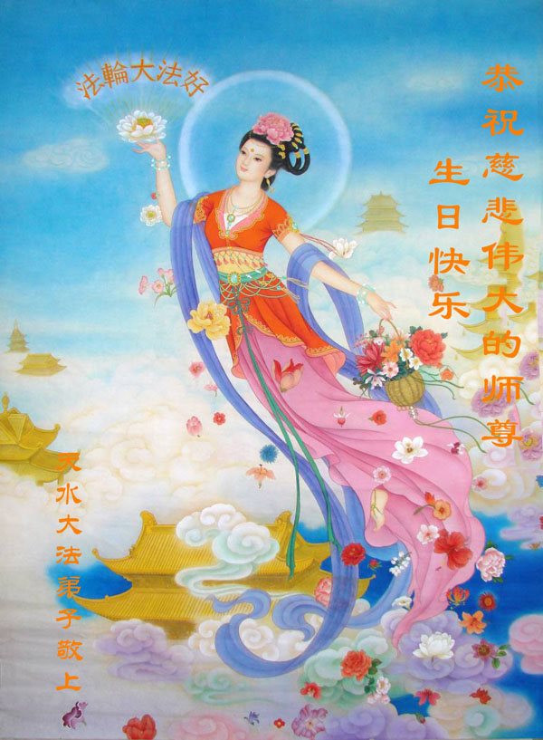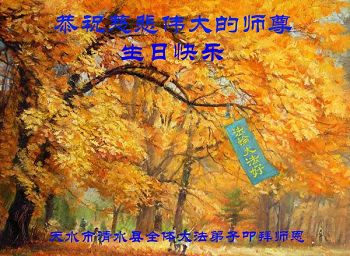 辽宁省抚顺市一大法弟子祝师父生日快乐!祝贺世界法轮大法日!一年过去了,又到师父的生日了。师父辛苦了,您又为天地间众生承受了一年的苦难啊!弟子想您,只能在您的法像前俯首叩拜。弟子谨遵师命,努力做好三件事,做一个合格的正法时期大法弟子。 今生有幸得师度, 千言万语难表诉, 学法修心破万难, 去执紧跟正法步。 辽宁省抚顺市大法弟子,庆祝世界法轮大法日!恭祝师尊六十六华诞!
