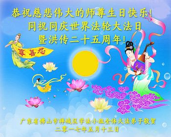 广东省佛山市禅城区学法小组全体大法弟子恭祝慈悲伟大的师尊生日快乐!同祝同庆世界法轮大法日暨洪传二十五周年!