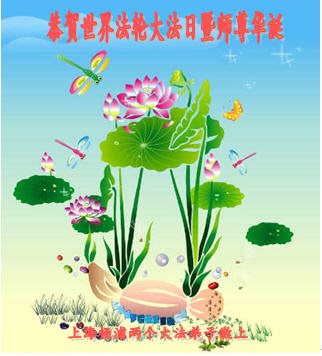 师父您好!弟子叩拜恩师! 风风雨雨,岁岁月月,千辛万苦,脱胎换骨,纵使万语千言无法表达弟子们心中的感恩!值此世界法轮大法日,弟子们向慈悲伟大的师父问好!师父您辛苦了! 山东东营胜利油田净莲学法小组并北京安德一学法小组一齐敬上 暂住上海的一大法弟子恭祝师尊生日快乐!恭贺世界法轮大法日!