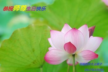 感恩师尊慈悲保护我一路走到了今天,您的浩荡佛恩,弟子无力回报,唯有努力做好三件事,精進实修达到标准,让师父放心。在这普天同庆的喜庆时刻,弟子想念师父,恭祝慈悲伟大的师尊生日快乐!庆祝法轮大法洪传25周年! 谢谢师父苦度! 沈阳大法弟子 二零一七年五月八日 辽宁省抚顺一个大法小弟子祝贺师尊生日快乐!