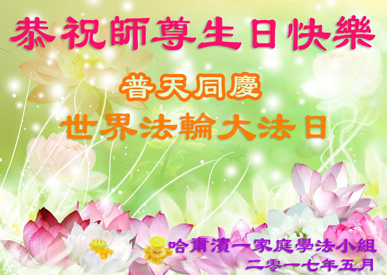 师尊您好:谢谢师尊对我和孩子的看护,师尊您辛苦了,让您费心了。 2017.5.8 河北省石家庄大法弟子一家感谢慈悲伟大的师父,祝师父生日快乐!普天同庆、同祝法轮大法日!