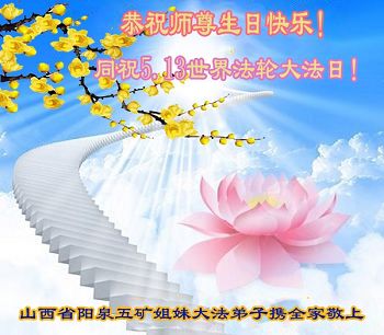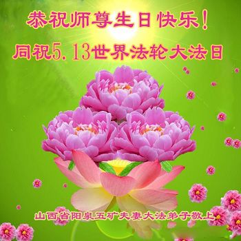 山西省阳泉五矿夫妻大法弟子恭祝师尊生日快乐!同祝5.13世界法轮大法日!