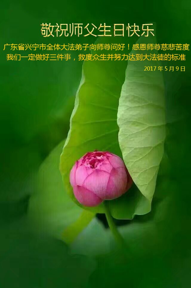 师尊您好!恭祝师尊生日快乐! 我与家人同修在师尊的慈悲保护下走到今天, 弟子跪拜恩师的救度之恩, 弟子一定会坚定正念,不忘使命, 走好以后的路,圆满随师还。 广东省梅州市兴宁市全体大法弟子向师父问好并祝世界法轮大法日!