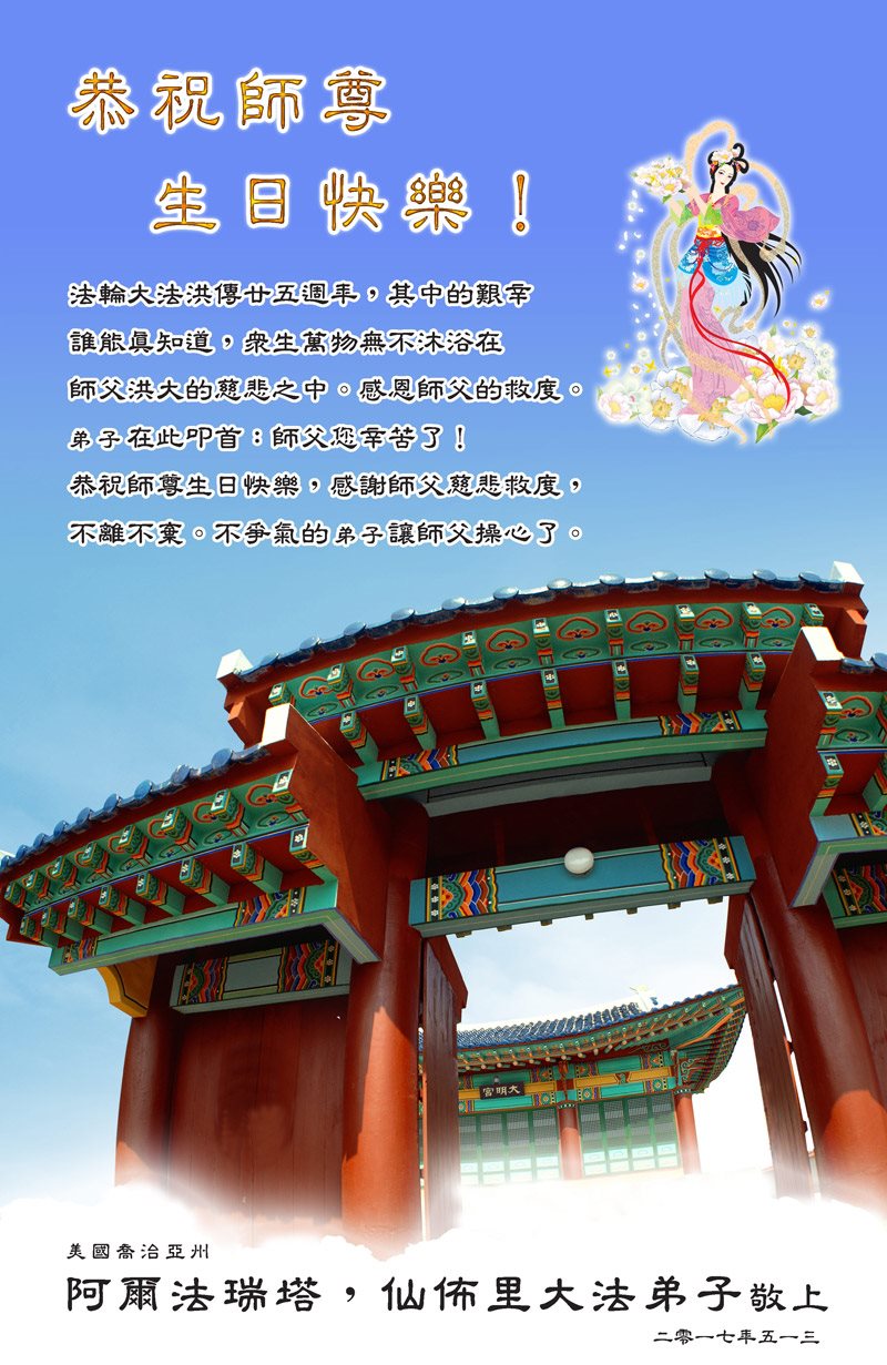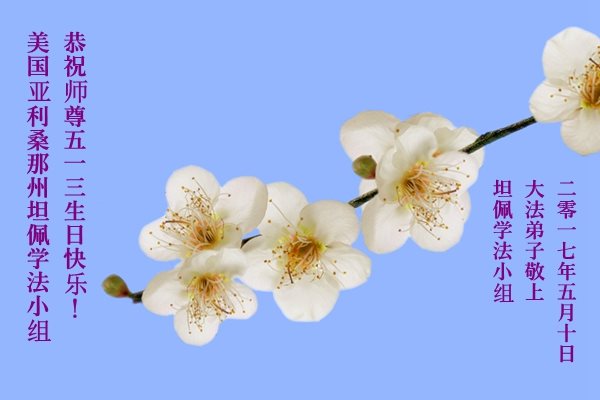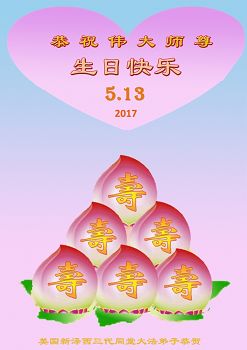 美国乔治亚州阿尔法瑞塔,仙布里大法弟子恭祝师尊生日快乐! 美国纽约橙县大法弟子及亲朋好友恭祝伟大的师父生日快乐! 旅居纽约的长春大法弟子一家三口恭祝师尊华诞!普天同庆法轮大法日!弟子一家叩谢师尊救度洪恩!弟子定当承担起使命,助师正法,兑现誓约,广救众生! 美国亚利桑那州坦佩学法小组恭祝师尊五一三生日快乐!普天同庆世界法轮大法日!