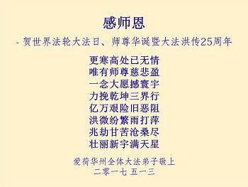 拜谢师尊慈悲洪恩!亚利桑那州大法弟子叩谢师恩! 美国密西根州全体大法弟子恭祝师尊华诞!同庆世界法轮大法日!
