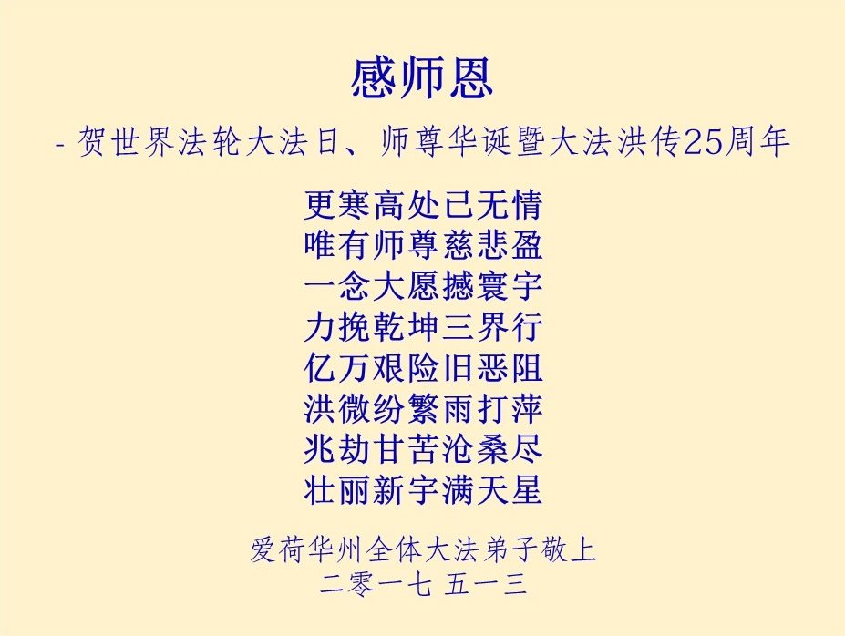 感师恩 更寒高处已无情 唯有师尊慈悲盈 一念大愿撼寰宇 力挽乾坤三界行 亿万艰险旧恶阻 洪微纷繁雨打萍 兆劫甘苦沧桑尽 壮丽新宇满天星 美国拉斯维加斯全体大法弟子恭祝师尊生日快乐!