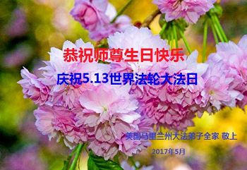 携大陆全家大法弟子及支持大法的家人恭祝师尊生日快乐!叩谢师尊的救度之恩!携新得法的三位新同修恭祝师尊生日快乐!借师尊洪传大法25周年之际的契机,勇猛精進,多救众生,圆满随师还!感谢师尊的慈 悲苦度!合十叩谢师尊! 从广东省广州来到美国的大法弟子叩拜师尊!恭贺师尊华诞,普天同庆世界法轮大法日!