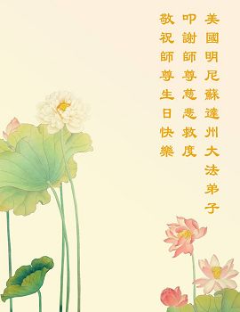 美国明尼苏达大法弟子全家恭祝慈悲伟大的师父生日快乐!