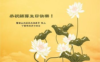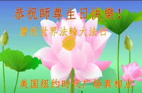 二零一七年五月十三日是法轮大法洪传世界二十五周年,也是恩师的华诞,普天同庆、同颂、同感恩。感恩师父普度,感恩大法福祉。这殊胜的时刻,弟子吟唱《师恩颂》: 回想起您传法的日日夜夜,泪水啊,再一次洒满胸前,有谁能知道您的心酸,有谁能知道您的艰难,看那金色的法轮,出现在那美丽的彩云间,慈悲的您知道众生在期盼,期盼着大法降临人间。回想着您多年的正法 路,泪水啊再一次洒满胸前,有谁能知道您付出的心血,有谁能知道您承受的一切,看那金色的法船,满载着众生驶向彼岸,是您力挽狂澜,救度苍穹在坏灭的瞬间。回想起远古的记忆,一幕幕展现眼前,铿锵的誓 言回荡在耳边,神圣的誓约依然记在心间,我们为了众生而来,助师正法何惧下苦海,是您,带着我们走过魔难,风雨中您将大法的威德显,听那普天的颂赞,万古的机缘洒满天地间,是您带着众生走向未来,大法的光辉永远照耀在苍宇间。 纽约时代广场真相点大法弟子:恭祝师尊生日快乐!庆贺世界法轮大法日!