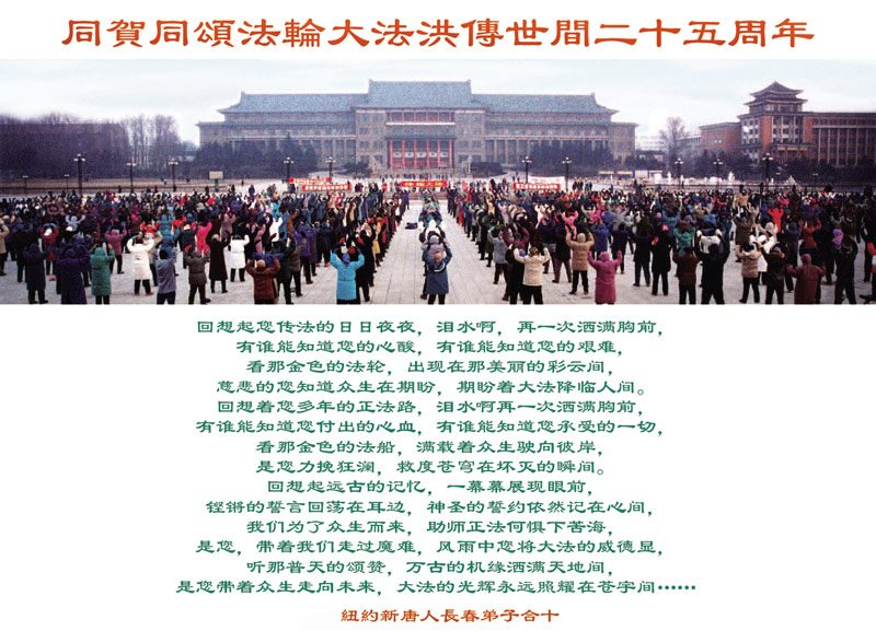 纽约新!唐!人:吉林省长春大法弟子贺师尊华诞!同祝同颂法轮大法洪传世间二十五周年!普天同庆世界法轮大法日!