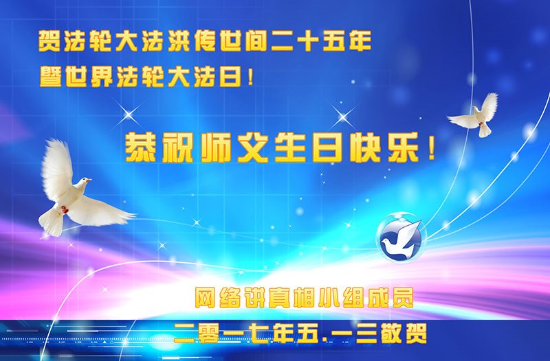 【明慧网二零一七年五月十三日】 网络讲真相小组全体成员恭祝师父生日快乐!普天同庆5.13世界法轮大法日!