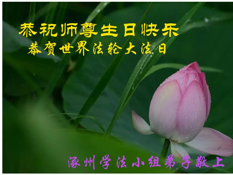 师父您辛苦了!我们学法小组四名成员跟随师父修炼,风风雨雨这些年,每一步的提高都体会到了师父苦心点悟、师父的慈悲保护,弟子感恩师父,谢谢师父救度。今后抓紧时间修好自己,多救人。我们祝师父生日快乐!恭贺世界法轮大法日! 河北保定涿州双塔一学法小组敬上 河北保定西郊学法小组恭祝师父生日快乐!